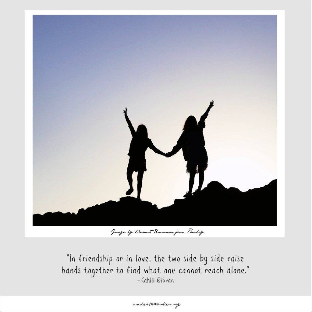 “In friendship or in love, the two side by side raise hands together to find what one cannot reach alone.”