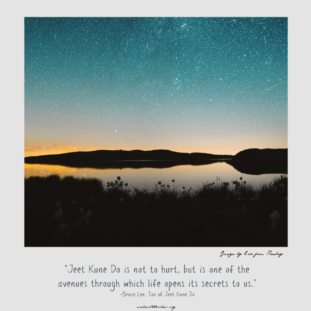 “Jeet Kune Do is not to hurt, but is one of the avenues through which life opens its secrets to us. We can see through others only when we can see through ourselves and Jet Kune Do is a step toward knowing oneself.”