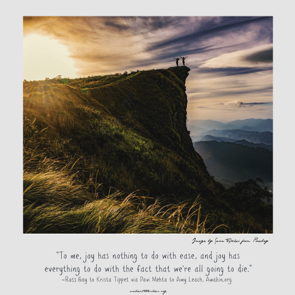 “Ross Gay, who’s a poet who also speaks very highly of your work. He said in an interview with Krista Tippet, ‘Sometimes I think there’s this conception of joy as meaning something easy. To me, joy has nothing to do with ease, and joy has everything to do with the fact that we’re all going to die. When I’m thinking about joy, I’m thinking that at the same time as something wonderful is happening and that connection is being made in my life, we’re also in the process of dying.’ And that’s every moment. Your work is so joyous, and it comes up in a lot of the reviews that people write about your work. “It’s exhilarating. It’s exuberant. It’s joyful.” And I’m wondering, for you, how does that joy connect with transience or impermanence?”