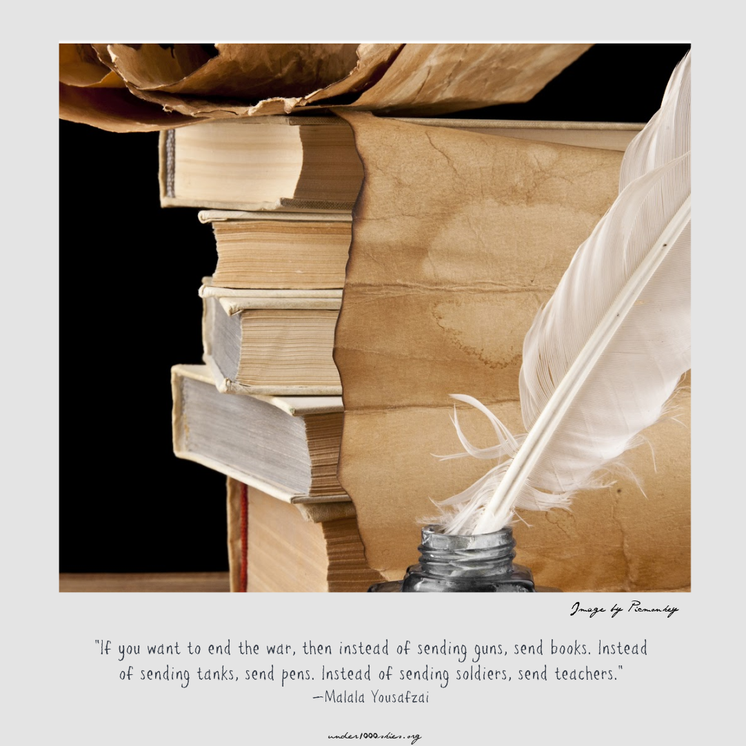“If you want to end the war, then instead of sending guns, send books. Instead of sending tanks, send pens. Instead of sending soldiers, send teachers.” —Malala Yousafzai