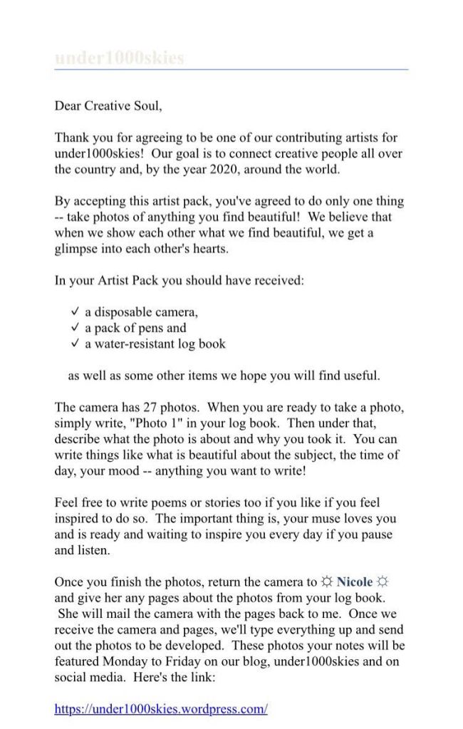 In a nutshell, under1000skies is about connecting homeless creatives to each other and to the world. We are 100 percent not-for-profit, and we will never ask for money. Our only purpose is to bring inspiration and beauty into the world and connect with creative souls.