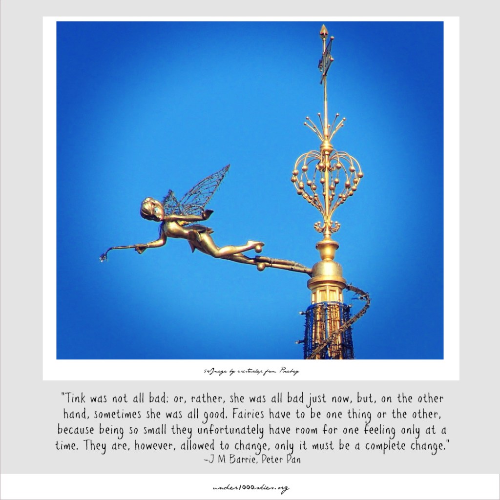“Tink was not all bad: or, rather, she was all bad just now, but, on the other hand, sometimes she was all good. Fairies have to be one thing or the other, because being so small they unfortunately have room for one feeling only at a time. They are, however, allowed to change, only it must be a complete change.”