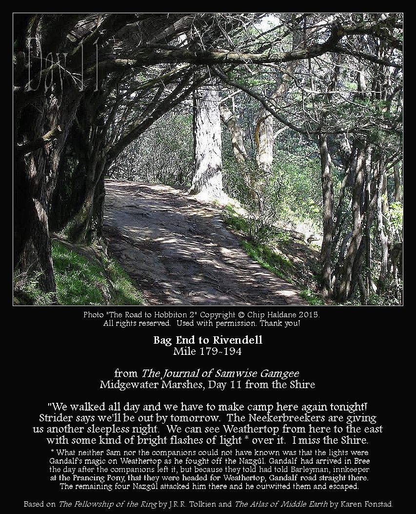 (7 Oct – 15th Day from the Shire – Dawn) In the night, the Nazgûl attacked. I couldn’t find Mr. Frodo, then I heard him cry out as from far away — strange words they were! Then, when he appeared, he was bad hurt! Strider fought the cursed things off. At full light, we made our way down to the Great Road. As we crossed, we heard the Riders and ran into the brambles. We camp here tonight. Strider says Mr. Frodo’s wound came from a Morgul-blade and is cursed!